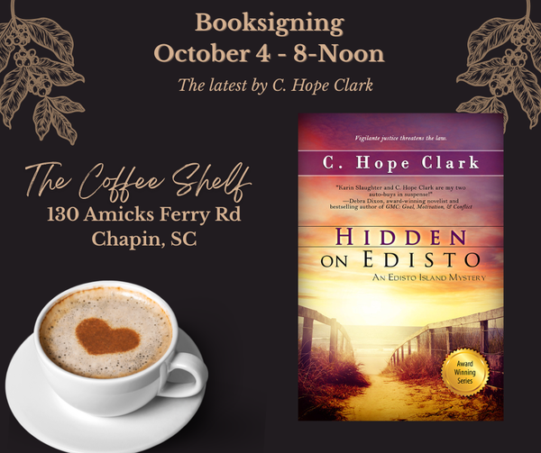 -Oct 4, 2025 - Signing The Coffee Shelf, Chapin, SC 8AM-NOON -Oct 11, 2025 - Signing The Edisto Island Bookstore, Edisto, SC - 3-5 PM -Oct 13, 2025 - Edisto Art Guild, Edisto Island, SC - 7-8:30 PM -Oct 14, 2025 - Moncks Corner Book Club,